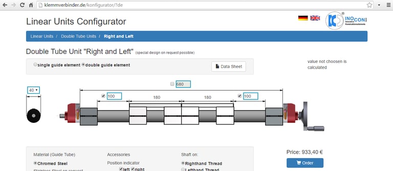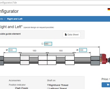 Im folgenden Beispiel kann der Nutzer Zubehör für eine Verstelleinheit wählen. Ohne Konfigurator wäre das Suchen von erlaubten Kombinationen und die Preisberechnung sehr mühselig. Einfacher geht es mit der interaktiven Vorschau. Der Kunde erhält so auch direkt einen Einblick in die Abmessungen der Bauteile.